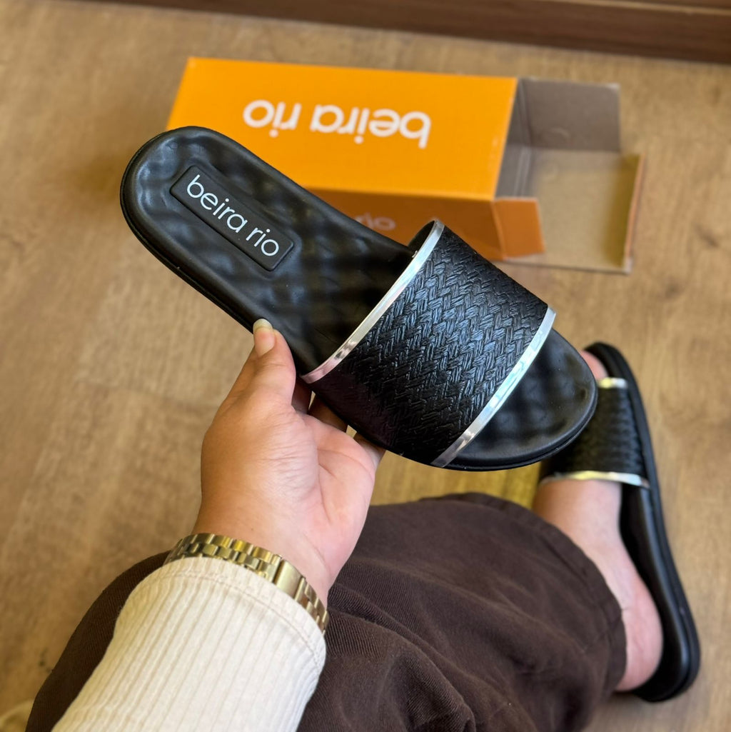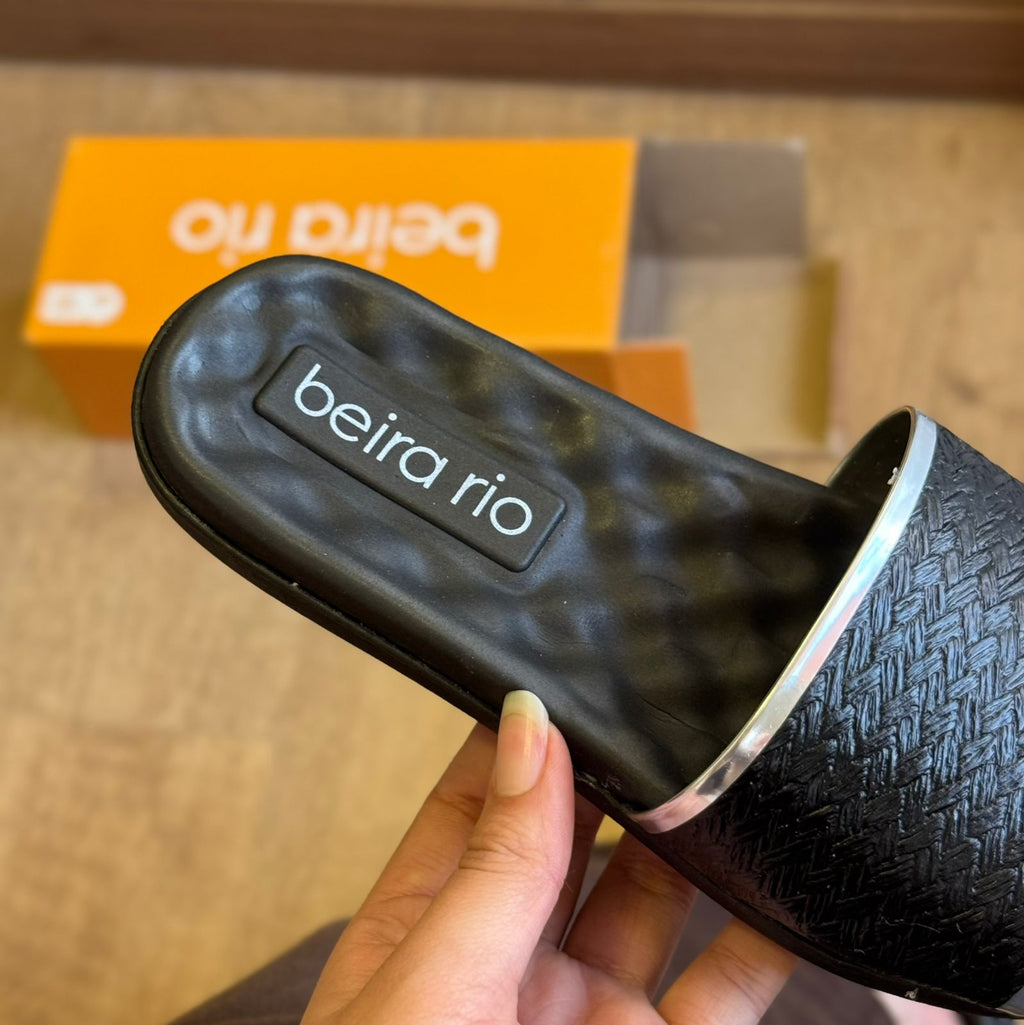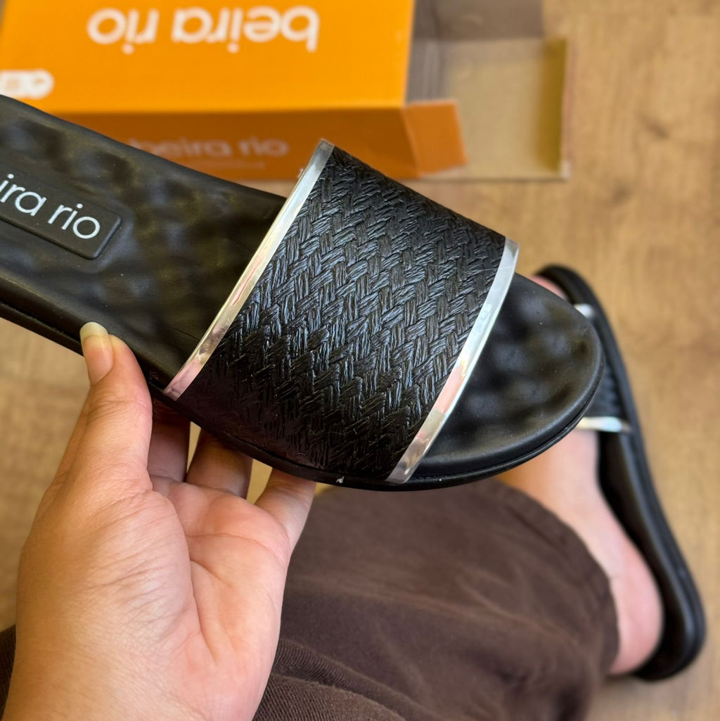 A Sandália Beira Rio Oca 8360.353.30445 combina conforto e praticidade em um design moderno. Feita em material sintético preto com textura trançada no cabedal, ela possui detalhes metalizados prateados que dão um toque de sofisticação ao visual. O solado anatômico garante bem-estar para o dia a dia, tornando-a ideal para compor looks casuais com estilo e leveza.